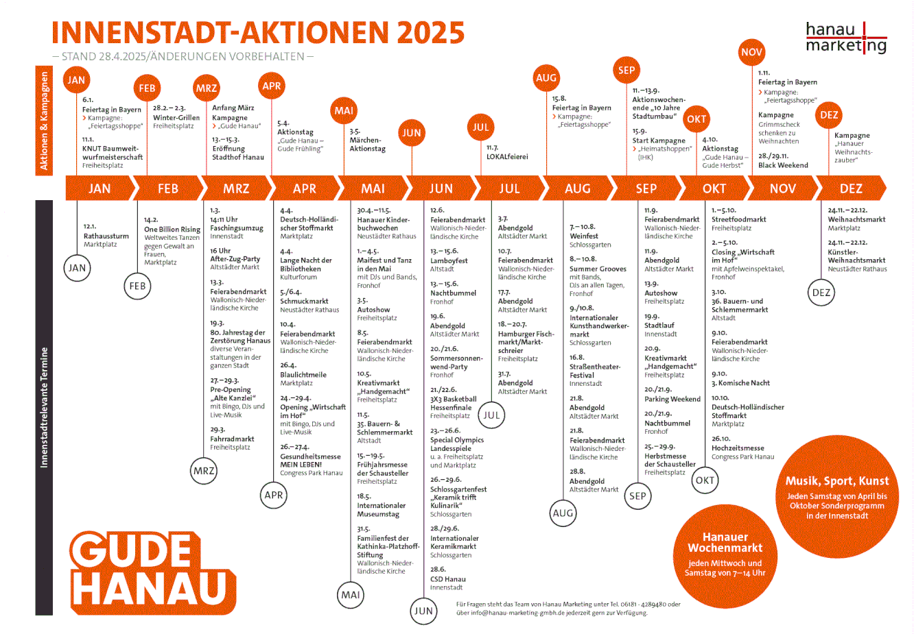 Der komplette Rahmenplan ist im Veranstaltungskalender auf hanau.de sowie unter www.gude-hanau.de zu finden und steht zudem als gedruckte Version an zahlreichen Orten in der Stadt zur Verfügung, natürlich auch im Service-Center Hanau aufLADEN (Nürnberger Straße 31-33).